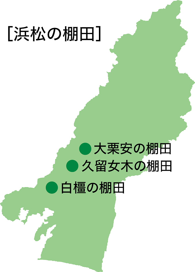 浜松市の主な棚田は、浜名区引佐町の久留女木の棚田と白橿の棚田、天竜区の大栗安の棚田の3地域です。これらの地域では、農家を中心に自治会や民間企業、大学などが連携し、共同作業や交流イベントなどに取り組む事で、営農ボランティアや耕作者の確保に繋がり、棚田が保全されています。2022年にはこうした取り組みが評価され、「つなぐ棚田遺産」として農林水産省から認定を受けました。